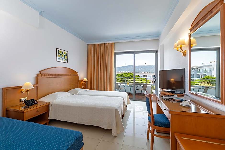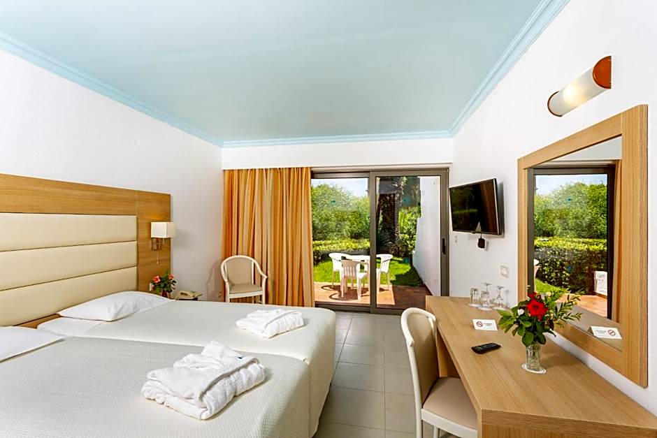 Family Garden View is 344 square feet and includes 2 single beds 80-130 width plus a sofa bed and rollaways on demand plus terrace, safe, and bathrobes.